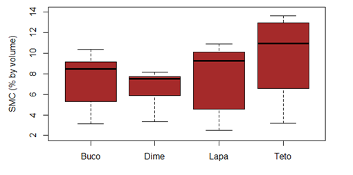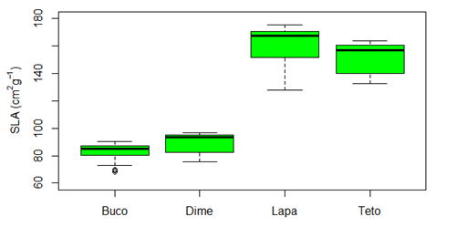 Figure 1 Boxplot of difference between (A) soil moisture content (SMC) below the canopy, (B) leaf area (LA) and (C) specific leaf area (SLA) of the four deciduous tree species. Boxplot shows median and interquartile range, whiskers indicate the range. Buco, Buchanania cochinchinensis; Dime, Diospyros melanoxylon; Lapa, Lagerstroemia parviflora; Teto, Terminalia tomentosa.