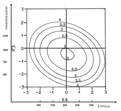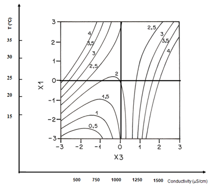 The relationship (3) is used to plot the curves of the isoreponses. These curves are helpful in studying the effects of the variation of the factors in the domain studied and in determining the optimal conditions. The graphical representation of the results permits a better visualisation of the effects of different factors. Figures 1 & Figure 2 plot the isoreponses curves obtained for the concentration of chromium, respectively in the plan [temperature (X1). conductivity (X3)] and [conductivity (X3). redox potential (X4)], with X2 fixed at 0. From examining the Figure 2, we can note that the amount of chromium increases essentially when the conductivity is lower 750 µS.cm-1 when the temperature is lower to 15 °C and for a pH fixed to 8. The contour plots in this figure shows that the optimum of chromium can be obtained for a conductivity situated between 1000 and 1250µs.cm-1, for a redox potential situated between 150 and 200 mV for pH fixed at 8 and a temperature fixed at 25°C. In contrast the influence of pH presents a negative effect. But the interaction of this factor with the conductivity is not negligible. However, the optimization of the removal Chromium from natural water destined for human alimentation will depend on only some measures of some physical and chemical parameters, but also of the stability of these factors to the course of the analysis of the heavy metals especially by spectroscopy of atomic absorption methods without flame.