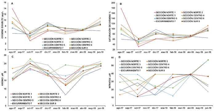Figure 3 Spatio-temporal variation of Dissolved Oxygen (A), Oxygen Saturation (B), Ammonium (C) and Nitrates (D), in the Oriente Quarry, Mexico.
