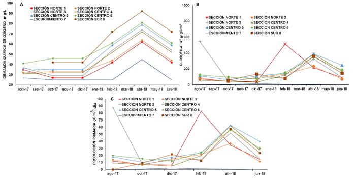 Figure 5 Spatio-temporal variation of Chemical Oxygen Demand (A), Chlorophyll (B) and Primary Production (C), in the Oriente Quarry, Mexico.