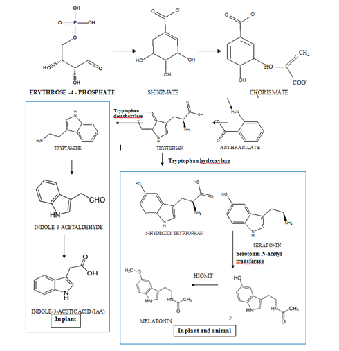 As mentioned, melatonin is derived from amino acid precursor tryptophan with a phylogenetic ubiquitous distribution. For a long time, it was portrayed that this neuro-hormone was synthesized only in the pineal gland of vertebrates.29 Later, the identification of melatonin in photosynthesizing organisms opened a new meadow of research on this compound. Tryptophan is an essential amino acid and hence, animals lack the ability to synthesize it; they must obtain it from other natural sources.30 In plants, tryptophan provides precursors for melatonin along with hormone auxin, phytoalexins, glucosinolates, alkaloids and indoleamines.31 The rate of melatonin formation in higher plants follows a rhythmic variation with nocturnal maximum and seasonal fluctuation with maximum in flowering stage.32 Tryptophan is biosynthesized through shikimic acid pathway via chorismate and anthranilate. Tryptophan is converted to 5-hydroxy tryptophan by tryptophan hydroxylase and subsequently to serotonin. Serotonin is converted to N-acetyl serotonin by arylalkylamine N-acetyl transferase (AANAT) from which melatonin is synthesized by hydroxyindole-O-methyltransferase (HIOMT). It should be noted that melatonin is synthesized by plants themselves even though arylalkylamine N-acetyltransferase (AANAT) has not been detected yet. Thus, the genetic characteristics of serotonin N-acetylating enzyme in plants may differ greatly with regard to its sequence and structure from the animal AANAT. Indole-3-acetic acid (IAA) is synthesized exclusively in plants from tryptophan by tryptophan decarboxylase (Figure 1).33‒35
