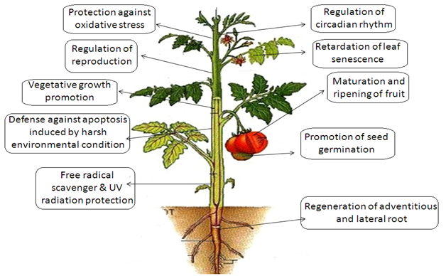 Melatonin plays an important aspect to regulate several physiological role of plants viz. circadian regulator, cytoprotector and growth promoter, antioxidant and free radical scavenger.73 It also promotes rhizogenesis, cellular expansion and provide defense against environmental stress condition.74 At present, two diverse aspects of phytomelatonin gained the utmost importance: