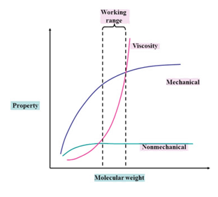 Polymer properties: Polymers properties depend on their molecular mass and chemical structure. Polymer properties dependence on molecular mass for a hypothetical polymer is shown in Figure 1.1 Being cross links in polymer chains improves polymer mechanical properties. In thermoplastic polymer with no cross link, polymer chains slip on one another because of power or heat and Vendorous forces between them disappear. After movement, intermolecular forces appear again. Thermoplastic polymer returns to its first state weakly. This happening is shown in Figure 2.2 Cross link in thermoset polymer restrict polymer chain relative movement and it can be considered that under power shape shift in this polymer is like a three dimensional network under power shape shift. Polymer chains move a little from each other by electric charge or heat in thermoset polymer; but cross link won’t be distinguished (unless at the last charge). Heat causes displacement in a part of chain or in a chain in thermoplastic polymer and it makes chains split on each other and polymer loses its solid state. Cross links restrain polymer chains from too much move in thermoset polymer. So it would be expected that thermoset polymer mechanical properties reduce because of heat; but since cross links doesn’t distinguish, these mechanical properties doesn’t lose completely. Heat effect on polymer mechanical properties is shown in Figure 3 symbolically.3