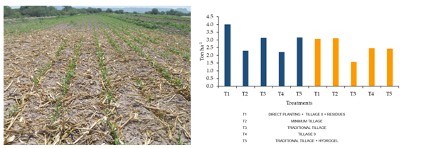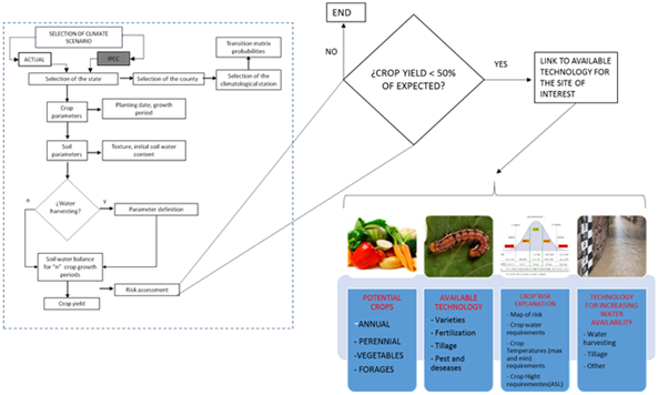 The national Institute for Forestry, Agricultural and Livestock Research of Mexico (INIFAP) has supported the development of research in strategic experimental watersheds of arid northern Mexico. In these watersheds, hydrological information has been obtained for providing basic information to ranchers on the current status of their grassland under the actual management. Trough hydrological monitoring the hydrological behavior of the experimental watersheds has been characterized. The measurement protocol may be utilized in any watershed with scarce instrumentation and may serve for the design of water harvesting or runoff farming systems. Figure 1 shows a gauging device for measuring runoff in the experimental watershed San Luis del Cordero watershed in the state of Durango, Mexico. Within the agricultural portion of the experimental watershed research regarding different options for increasing rainfall productivity in rain feed and runoff agriculture has been developed. Some tillage systems have been evaluated. Figure 2 show some results where direct planting with cero tillage and using 33% of soil cover with corn residues has been the best option. For widening the impact of the research results, availability of information should be readily available to users and technicians for proper decision taking on natural resources conservation endeavors within watersheds studies.5 Also, scientific collaboration between institutions is a crucial aspect for sound research6 For instance Sanchez et al.,7 developed an expert system for decision support on rain feed agriculture in Mexico. The system has pre-loaded climatic information from where different scenarios may be analyzed in terms of water availability for crops and to define economical risk (Figure 3).