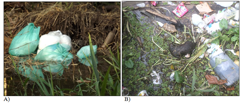 It is noteworthy that the study area does not have a sewage system, and therefore, the organic waste of the population's physiological needs (stool and urine) is destined for dry pits (rustic house with direct excavation in the uncoated soil, intended for receive only excreta without water linkage), black pits (wells or holes dug in the ground, without waterproofing or with partial waterproofing, where raw sewage is disposed of by water) or directly into the stream (Table 3). However, 61 of the black pits and 46 of the dry pits are located 2 to 5 meters away from the stream. Regarding the garbage produced by the inhabitants, the results show that 189 families (73.54%) put household waste for public collection, 37 (14.40%) reported burning the garbage, mainly in the Amazon summer, where the water level of the igarapé is lower and 3 families (1.17%) dump their household garbage directly into the igarapé (Table 3). Although most of the population reported public collection and that it takes place twice a week, there was a lot of garbage thrown in the stream, including dead animals such as dogs and cats (Figure 3).