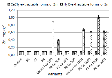 The levels of added copper - 500 and 1000 mg kg-1 soil (under the form of Cupric acetate solution) were consistent with the national law and represented maximum and intervention concentrations of copper for industrial and production sites respectively.25 A total of 12 variants were tested: Control, P6, P7, P8 without added Cu; Control Cu500, P6 Cu500, P7 Cu500, P8 Cu500 with 500mg kg-1 added Cu; Control Cu1000, P6 Cu1000, P7 Cu1000, P8 Cu1000 with 1000mg kg-1 added Cu. In a previous study,26 pseudo-total (PT) forms of heavy metals, extracted by aqua regia and bioavailable forms, extracted by 1M NH4NO3 were assessed and reported. Statistically significant correlation between bioavailable forms of Cu extracted by 1M NH4NO3 and Cu concentration in plants (R=0.798) was obtained. A pot experiment was carried out with the investigated soils in a greenhouse, using 1 kg containers in three replications with test plants (Eruca sativa). Plant biomass was harvested 21 days after sowing and heavy metal concentrations in plants were analyzed. Plant samples were digested by concentrated HNO3 and H2O2 on a sand bath until clarification of the solution and after that heavy metal concentrations were analyzed by AAS.27 Soils from the greenhouse experiment were used for further chemical analyses. Soils were sieved through 1 mm sieve (non-rhizosphere soil) and major soil properties were analyzed. The cation exchange capacity was determined by the method of Ganev and Arsova.28 Soil reaction was measured in 1:2.5 – soil: water suspensions. Soil organic matter was analyzed by the method of Tyurin.29 Heavy metals in soils were determined by the following methods: water soluble forms in soil water (ratio 1:10) and shaking for 1 hour;30 0.01M CaCl2 extractable forms in soil:sollution ratio (1:10) and shaking for 2 hours;13 EDTA extractable forms in 0.05M EDTA (pH 7), soil:sollution ratio of 1:5 and 30 minutes of shaking.31 Pseudo-total forms of metals (PT) were analyzed by aqua-regia digestion.32