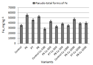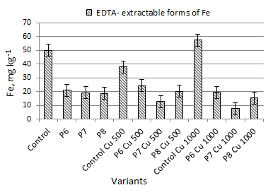 Pseudo-total forms of iron in the Control variant (Figure 6) were close to the average values in soils worldwide 35 400mg kg-1 (~3.5%).8 In the Technosols (P6, P7 and P8) pseudo-total forms of Fe were considerably higher, 5 – 5.5 %, due to the activity of the steel works. The addition of copper, similarly to lead has again caused a decrease in pseudo-total forms of Fe in Technosols (Figure 6). A similar trend, as for Cu was observed for Fe, regarding the proportion of EDTA extractable forms (7.8 and 57.5mg kg-1) (Figure 7) from pseudo-total contents, i.e. higher proportions were found in the control soil than in Technosols. Soluble forms of Fe extracted by CaCl2 and H2O (0.08 - 1.35 mg kg-1 are presented in Figure 8). Only in the control soils (Control, Control Cu500, Control Cu1000), apart from Cu addition, H2O extracted more Fe than in the other variants. As regards Fe, a significant positive correlation between EDTA and H2O extractable forms was observed (R=0.875; R2=0.766), (Table 2). At the conditions of the Technosols (pH=7.6 - 7.7) iron is weakly extracted by EDTA, CaCl2 and H2O extractants. This could be due to the fact that in alkaline conditions the precipitation of iron is possible.8 As an essential element for plant growth and development, concentrations of Fe in food are not regulated. In our study Fe concentrations in plants ranged from 156mg kg-1 in the control variant to 1210mg kg-1 in the P7 Cu500 variant (Table 3) pointing at contamination by the activity of the metallurgical smelter and accumulation of iron in plant biomass. The content of Fe in plant biomass was negatively correlated with the contents in water and EDTA-extracts (R=-0.684 and R=-0.731), (Table 4), making those extractants unsuitable for predicting Fe uptake by Eruca sativa plants at the conditions of increasing Cu loadings. The reason could again be the speciation of Fe into different complexes in solution and unavailability of the specific Fe-organic complexes extracted by 0.05M EDTA in the soils studied.