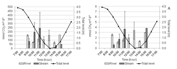 Figure 3 Mean CO2 (mmol m-2 d-1) and CH4 (mmol m-2 d-1) flux on water surface in comparison to tide level variation, at different times of the day. (A) CO2 and CH4 flux in the river and stream in the dry season.