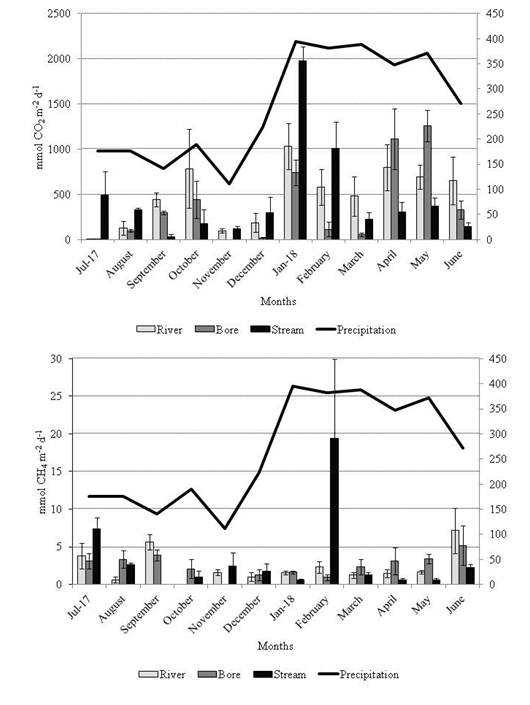 Figure 6 CO2 and CH4 flux (mmol m-2 d-1) in the river, bore and stream, over a hydrological year in Mojuim estuary. The bars indicate the mean standard error.