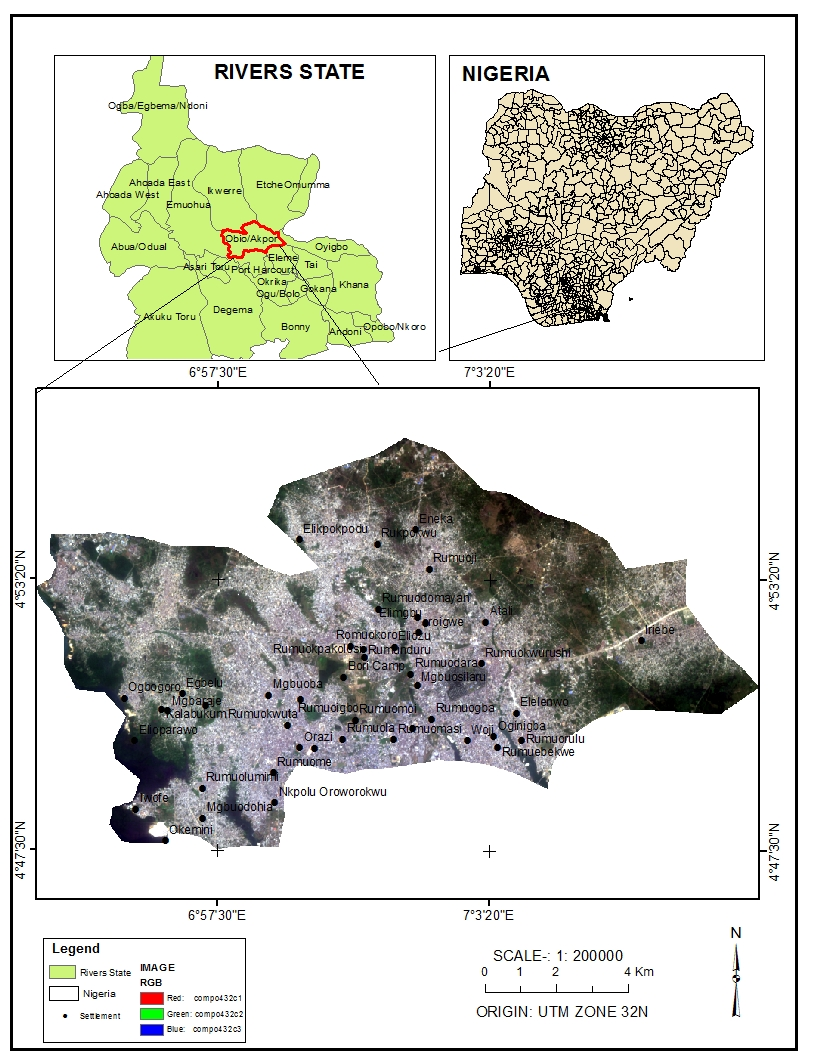 Obio/Akpor Local Government Area falls within the Metropolitan region of Port Harcourt, the oil and gas hub of Nigeria, one of the major cities of the Niger Delta located in Rivers State. The Local Government Area covers an approximate area of 260 km2 with a population of 464,789.8 Obio/Akpor is bounded in the South by Port Harcourt City Local Government area, Oyigbo and Eleme to the East, Etche and Ikwerre to the North, and Emohua to the West. It is located between Latitudes 4°45'N and 5°00'N and longitudes 6°50'E and 8°00'E. The Local Government Area is a lowland area with an average elevation below 30m above sea level. Significant changes in the land use/ land cover in the area include changes in water bodies, built-up areas, depletion of the mangrove vegetation along rivers and creeks shorelines, vegetation, and wetlands. The mean temperature ranges between 30.0°C - 33.0°C, while the annual rainfall ranges between 2100 mm – 4600mm as reported by Nigerian Meteorological Agency.9