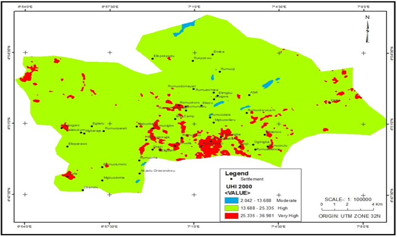 The Urban Surface Temperature Varies from 2.042°C to 36.981°C with an average temperature of 23.480 °C across various Land use and Land cover (LU/LC) in the area. The moderate zone is between 2.042°C to 13.688°C which is the water body represented on the map with a ‘blue colour’ because of the low energy radiation. The high area varies from 13.688°C to 25.335°C which is a vegetative area represented on the map with a ‘light green colour’. Area such as Eneka, Rumuokwu, Elikpokodu, Rumuoji, Rumuodomaya, Rumuewhera, Oroigwe, Atali, Rumuokoro/Eliozu, Rumuodara, Mgbuosilaru, Rumuokwurusi, Egbelu, Mgbaraie, Kalabukum, Elioparawo, Mgbuodohia, Rumuolumini, Iwofe and Ogbogoro falls under this zone. The very high zone varies between 25.335°C to 36.981°C which is the build-up area shown on the map as a ‘red colour’. The built-up area consists of roads (paved and unpaved), commercial, residential, and industrial buildings. This area is inundated with higher temperature because of the high consideration of human activities. These areas include Rumuomasi, Woji, Rumuogba, Rumuola, Eligbam, Orazi, Rumuokwuta and Rumuoigbo. From the analysis in 2000, the higher temperature is at the central-southern part of the study area Figure 7.