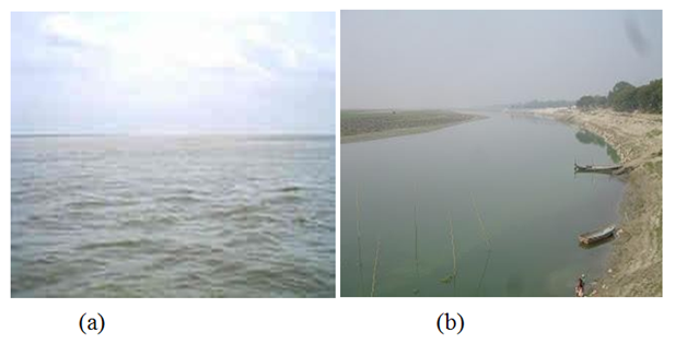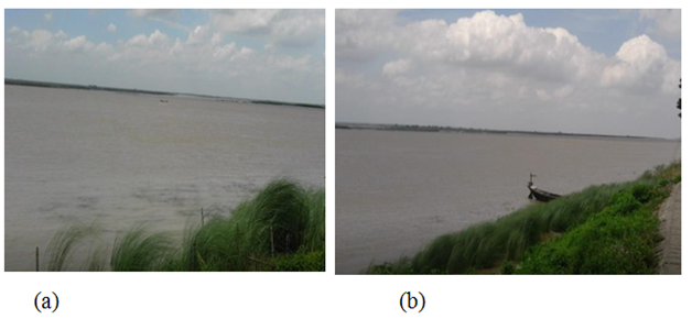 Figure 6 (a) Distributing water from pond for irrigation; (b) View of floating Pontoon on the river Padma at about 2.80 Km away from the pond project.