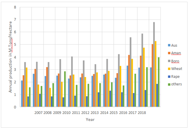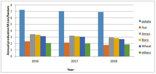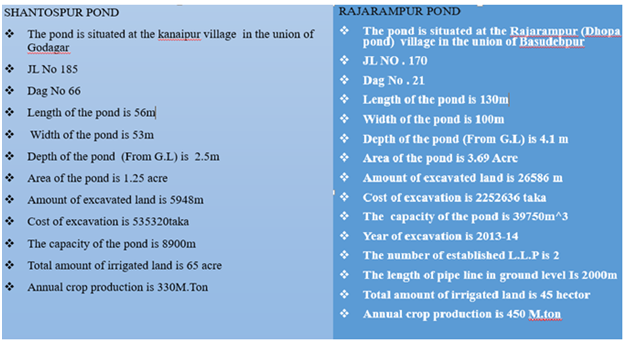 The discharge data of Padma river and mohanonda river (shows that in the year 2007 to 2018 the highest and lowest discharge. We have seen that the rate of highest and lowest discharge are much fluctuating. But for both the Padma and Mahananda river we have seen that the highest discharge occurs in the monsoon, when the river is filled by water where the lowest discharge occurs during the dry season. It is also seen that the highest and lowest water level of Padma and Mahananda river is decreasing in drought season and increasing a little bit in the rainy season or monsoon. For the construction of Farakka barrage the Padma is becoming desert in the drought season. So, there must be an alternative way to store the water during rainy season for the use in the drought season. It is clear that under pond project the annual crops growth are increased compared to outer parts of the areas. As the various crops are in large quantity the land owners are also happy to harvest their land under pond the project. These production of large amount of various crops are contributing to develop the national GDP. Most of the young generation are now involved to grow various crops under this pond project to reduce unemployment.