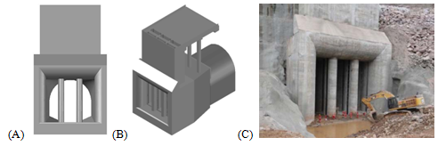 Figure 4 Inlet structure of the diversion tunnel 1. Figures (A) and (B) correspond to the design of the structure and figure (C) shows this structure during its construction phase.
