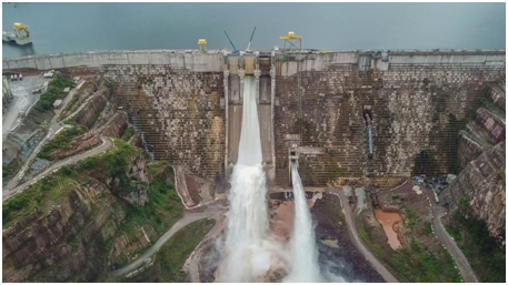 The graphic of the Figure 14 shows the reservoir water level, the inflow in the reservoir and the outflow through the bottom outlet, the spillway and the main powerhouse of the Laúca HPP. The minimum operational water level of the HPP, elevation 800.00m, was reached on April 25th, 2017. The Figure 13 illustrates the reservoir almost reaching the elevation of the spillway crest (830.00m) during the reservoir filling process. On April 20th, 2018 occurred the first operation of the spillway of the Laúca HPP (Figure 15). In the first days of June of the year 2018, the reservoir of the Laúca HPP reached the elevation 850.00m which is the normal water level of the reservoir. This was an important milestone of the project and it is possible to say, at the end of this important stage, that is the reservoir filling, that the whole process occurred well, without major intercurrences. The picture of the Figure 16 shows an upstream view of the reservoir after the conclusion of the reservoir filling process.2‒5