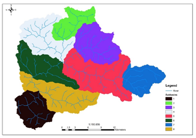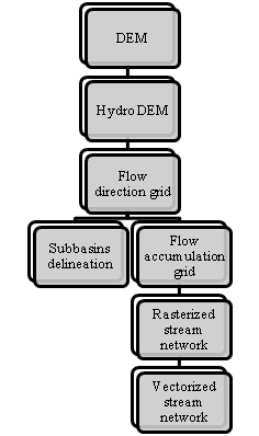 The preprocessing steps adopted in this study were carried out by using the ArcGIS software, based on a 30 meters resolution Digital Elevation Model (DEM) obtained from the Shuttle Radar Topography Mission (SRTM), developed by the National Aeronautics and Space Administration (NASA). The methodology is summarized in Figure 1 and explained subsequently. Initially the Fill tool, available in the Spatial Analyst toolbox, was used to fill the DEM’s surface depressions and to eliminate its imperfections, thereby generating the Hydro DEM of the study area. Afterwards the Flow Direction tool, run with the D8 method (Figure 2), was used to generate a raster which assigns a flow from each cell to one of its eight neighboring pixels, either adjacent or diagonal, in the direction of the steepest downward slope.13 Based on the flow direction grid, the Flow Accumulation tool was used to generate a new grid (Figure 3) which gives the flow as the sum of the amount of water flowing into each downslope cell.13 Subsequently, the Set Null tool was run in order to create a raster with the drainage network, by using the condition "Value <1000", and thus considering 1000 cells as the threshold of contributing pixels. To convert the raster network into a vector the Stream to Feature tool was used. Based on the hydrological, topological and pedological features of the study area, the subbasins’ outlets were created for each level of spatial discretization under study and its delineations (Figure 4-11) were obtained running the Watershed tool.