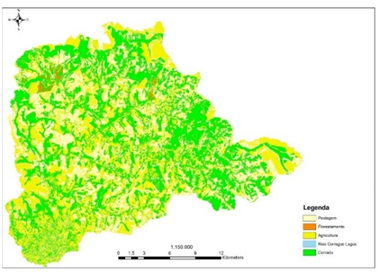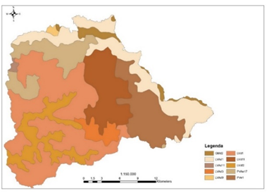 Considering that Brazilian soils do not fit the SCS’s hydrological groups descriptions, it was adopted a new classification proposal.19 This classification takes into account not only the soil’s texture, but also its characteristics and profile, reducing the modeler’s doubts.20 Although this classification was created based on soils situated in the State of São Paulo, it can be applied throughout Brazil where similar soils occur.21 The CN Map (Figure 5) was generated based on the data of the Land Use and Occupation Map (Figure 6), created by Uniube’s Geoprocessing Laboratory, and the Soil Map (Figure 7), adapted from the Soil Map of the State of Minas Gerais.22