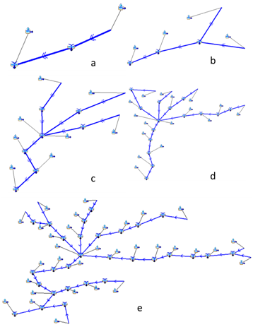 Figure 12 Distinct model configurations with diferent number of subbasins: two subbasins in a, four in b, eight in c, sixteen in d and thirty-two in e.