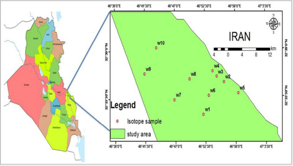 The study area is located in arid or semi-arid climatic regions. It suffers from a systematic water shortage that is exacerbated by rapid urbanization, industrialization, growing agricultural demand, and environmental degradation. Therefore, the study of isotopes will be useful in gaining a better understanding of the hydro geological processes of the surface water-aquifer interface, and the study of aquifers in this area has been initiated to provide the necessary information to allow the sustainable development of water resources in the region.1 In order to better understand the conditions of groundwater variability from the recharge to the exploitation zones, stable isotopes of oxygen (d18O) and hydrogen (dD) have been used.2,3 The natural isotopes (stable & unstable) contributes in many applications of hydrological, hydrogeological and geochemical sciences, which give evidence about of water sources, quality, and ages of water, in addition to recharge and movement of groundwater.4 The first studies on isotopes techniques in water were involved of precipitation and seawater. The first study was about survey on variations in concentration rate of 18O, after that followed by a study about variation 2H rate in natural waters, the variations of 18O in global precipitation scale, involving a discussion in great detail on the meteorological patterns.5,6 Many hydrological studies use the stable isotopes (18O, 2H) to determine the origin, recharge mechanisms and hydraulic connection of water molecules in groundwater. The climate of the study area is hot and semi-arid. The 22-year (1995-2015) average rainfall in the Missanarea is 33.2 mm and average temperature is 26 ºC. According to the FAO Penman – Monteith method for Ali-Al Gharbi station occurs with a high value from May to September with the maximum value occurring in Jun (450 mm day-1).7
