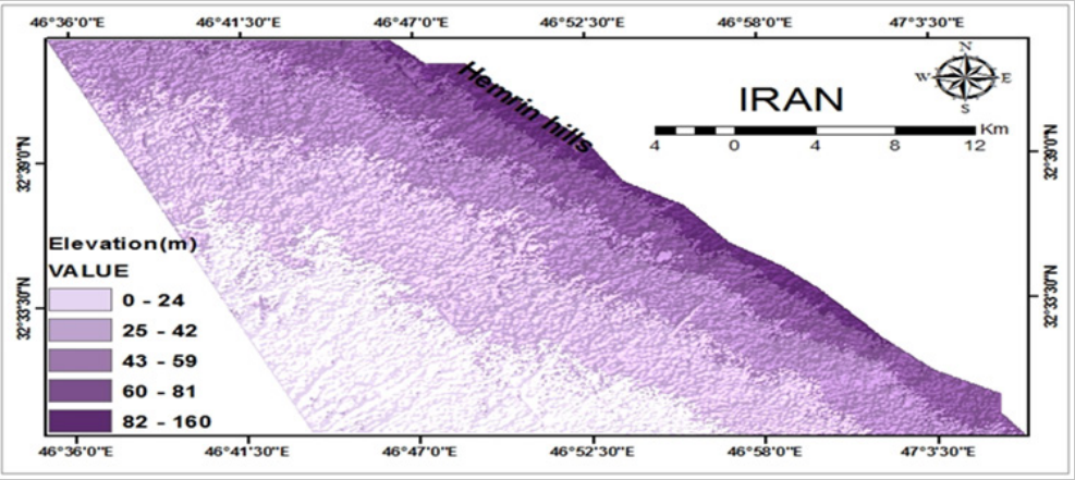 The study area is district that is called Ali Al-Gharbi and located in the northeastern of Missan province,the area of study about (760 km2), (Figure 1).The topography elevation ranges from (0–160m)is derived from the Digital Elevation Model produced by (USGS), (Figure 2). The surface is relatively flat in the central part of the area and bounded by Hemrin hills in the north-eastern near of the Iran. The surface elevations from north- east to south- west of the study area for district of Ali Al-Gharbi are decrease. The geological characteristics of study area are by the Rocks of uppermost Miocene and Pliocene are slope towards the Mesopotamian plain from the foothills along the Iraqi-Iranian border on the east. The rocks are buried under the Mesopotamian plain by thick layer deposits of Pleistocene and Holocene age.14 The study area is composed of different types of Quaternary deposits Pleistocene sequence. The quaternary sediment constitutes about 100% in study area, these sediments are gravel, sand, silt and clay.15 The sediments characterized of Quaternary are finer grained and unconsolidated than the underlying Mukdadiya and Bai Hassan Formations.16-18 Many deposits such as Alluvial fan, depression fill, sheet runoff deposits, and Aeolian deposits are the major units in the study area.19 The tectonic setting of study area was the largest part is within of eastern most unit the stable shelf (Mesopotamian Zone). The study area bounded in the north -east by the high folded zone that represented in the Hemrin hills.20,21