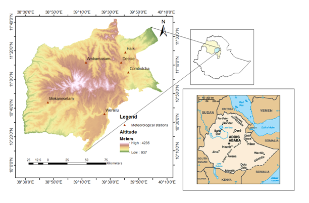 South Wollo zone is located in North east part of Ethiopia and in geographic terms it lies with in 10°12′N, and 11°40′N latitude and 38°30′E and 40°05′E longitude. Its zonal capital, Dessie, is found 400 kms North of Addis Ababa. It is one of the drought-prone and aid-dependent areas in Amhara regional state.19 It is found in Amhara National regional state in the federal political arrangement of Ethiopia. It covers a total area of 17,053.45 km2 and divided into eighteen rural and two urban woredas. South Wollo is characterized by diverse topographic features in which high mountainous and deeply incised canyons and gorges, valleys and plateaus with steep slopes dominate its most parts.31 The elevation ranged from the dry plains at 1000 m altitude in the east to the high peaks above 3500 m altitude in the west. However high-land areas ranging between 1500 m and 3500 m altitude are the dominating feature of South Wollo.8 Because of the diverse topography, the study area experiences different climatic conditions that range from hot and arid lowlands in the eastern part to cold and humid highlands in the western part.