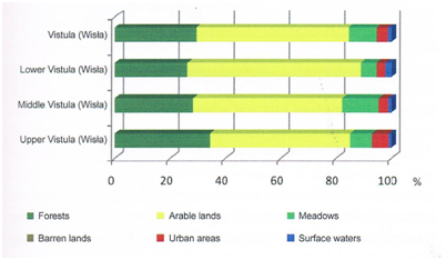 Land cover in a similar way as climatic conditions influences water resources and their management in the catchment.1 Cornie Land Cover distinguishes six types of land cover: forests, arable land, meadows, barren land, urban areas and surface water. The land cover in particular parts of the Vistula basin is shown in Figure 4. The area of the arable land is the most common in all parts of the catchment. Forests occupy smaller part of the catchment. In all three basin areas of the Vistula River, the land cover areas are similar. The forestation, which is very important for water retention is the highest in the catchment area of the Upper Vistula. The highest portion of arable land is to be found in the catchment area of the Lower Vistula.