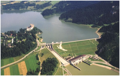 The Czorsztyn-Niedzica Dam was commissioned in 1997 just before the advent of high flood wave on the Dunajec River (right tributary of the Vistula). The flood wave filled the empty reservoir (232hm3) and thus decreased flood danger downstream of the dam. Earthfill dam is located in km 173.0 of the Dunajec River (Figure 5). The dam is 54m high and is equipped with surface spillway and outlet works. Its basic aim is flood protection, production of electricity and recreation. The hydroelectric plant of the capacity of 92 MW is equipped with reversible turbines. Due to located downstream equilibrium reservoir the power plant can operate in pumped storage system. Equilibrium reservoir secures also biological flow in Dunajec river of 9m3/s. Due to the reservoir (recreation) and power-plant (electricity production) considerable development of this poor region took place.