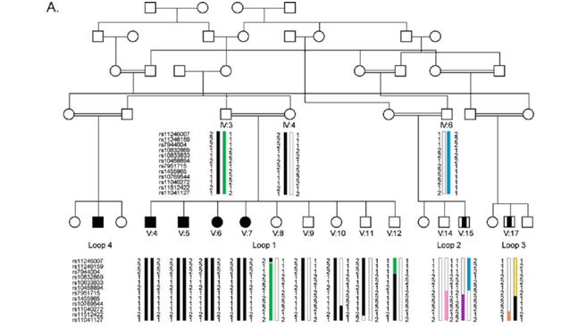Figure 1(A) Large consanguineous Pakistani family with AR-NSMR, showing haplotypes for 6 Mb telomeric linkage regions on 11p15.