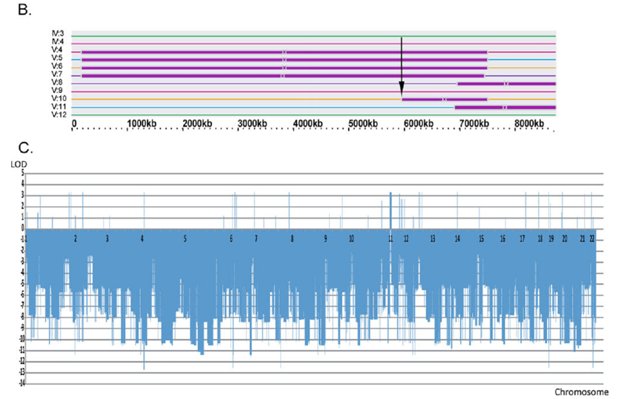 (C) The LOD scores calculation for different chromosomal regions of the entire genome using the programs LIP-SNP6 and LIPED.