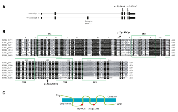 Figure 2 (A) PGAP2 structure showing Exons-Introns combination. Arrows indicate mutations. (B) Sequence of human PGAP2 and its alignment to other organisms. (C) PGAP2 encodes a transmembrane protein, and the p.Tyr99Cys and p.Arg177Pro changes are positioned in the Golgi lumen.