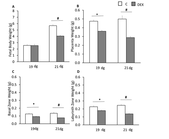 Figure 1 Effects of IUGR on fetal and placental weighs A, fetal body weight. B, placental weight. C, basal zone weight. D, labyrinth zone weight in control (C) and DEX (IUGR) groups at 19 and 21 days of gestation. *p<0.05 among C or DEX groups; #p<0.05 between C and DEX groups. Data represent mean ± S.E.M.