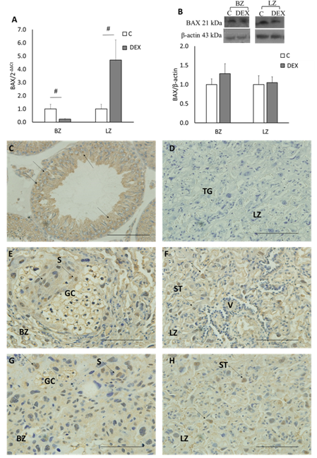 Figure 2 BAX gene, protein expression and localization in Basal (BZ) & Labyrinth (LZ) Zones. Bands of apparent molecular weight of ~21 kDa and ~43 kDa were detected for BAX and β-actin, respectively. A) BAX gene expression in BZ & LZ. B) BAX protein expression in BZ & LZ. #p<0.05 between C and DEX groups. Data represent mean ± S.E.M. C) The testis as a positive control for BAX using IHC staining. D) Negative control for BAX using IHC staining; cross section from rat placenta omitting the primary antibody. E & F) localization of BAX in C placenta sections. G & H) localization of BAX in DEX placenta sections. 40x magnification and a scale of 50 µm. ST: syncytiotrophoblast cells. BZ: basal zone. TG: trophoblast gaint cells. S: spongiotrophoblast cells. GC: glycogen cells. DC: deciduas cells; LZ: labyrinth zone.