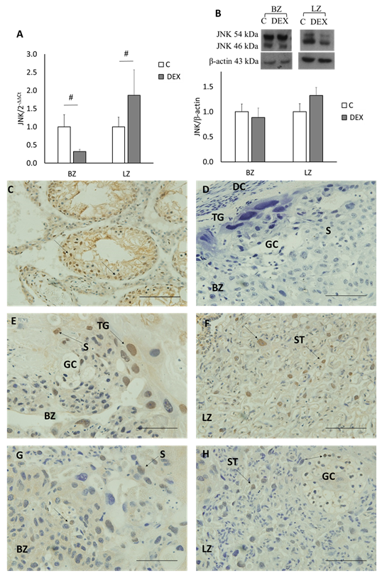 Figure 3 JNK gene, protein expression and localization in Basal (BZ) & Labyrinth (LZ) Zones. Bands of apparent molecular weight of ~54 & ~46 kDa (JNK) and ~43 kDa (actin) were detected. A) JNK gene expression in BZ & LZ. B) JNK protein expression in BZ & LZ. #p<0.05 between C and DEX groups. Data represent mean ± S.E.M. C) The testis as a positive control for JNK using IHC staining. D) Negative control for JNK using IHC staining; cross section from rat placenta omitting the primary antibody. E & F) localization of JNK in C placenta sections. G & H) localization of JNK in DEX placenta sections. 40x magnification and a scale of 50µm. ST, syncytiotrophoblast cells; BZ, basal zone; TG, trophoblast gaint cells; S, spongiotrophoblast cells; GC, glycogen cells; DC, deciduas cells; LZ, labyrinth zone.