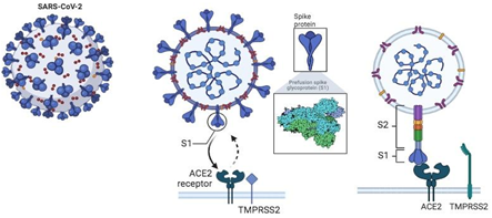Figure 1 SARS-Covid with S protein Surface with ACE2 receptor. S protein is conformed by 3 identical units like circle organized, put up with ACE-2 receptor like a key mediated membrane covering fusion of virus with membrane host cell that is being infected. The S protein is activated through cellular protease TMPRSS2 located to closer from ACE-2.