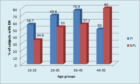 Graph 1B Distribution of DH within age groups in FL and NFL subjects:16-25 years: (p value= 0.01, Significant).