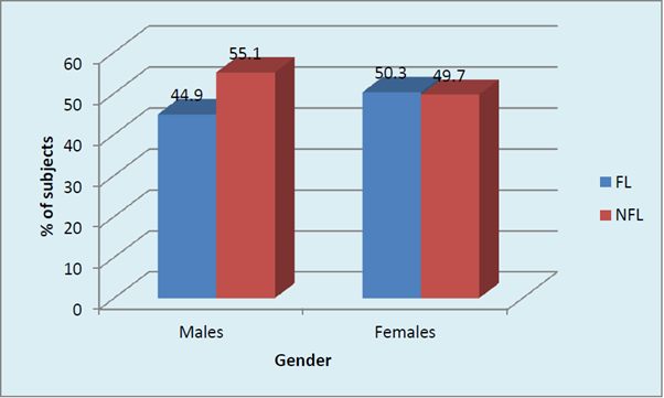Graph 2B Distribution of sample based on gender in FL and NFL subjects: Males and females in FL group (p <0.001, Highly Significant).