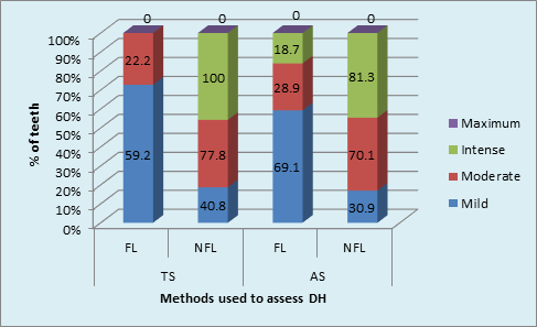 Irrespective of the method used, 21.7% teeth had DH in the FL group compared to 11.1% in the NFL group. Chi-square analysis (x2 = 79.43; p < 0.001, HS) showed highly significant correlation between fluorosis and DH. Fluorosis a definiteetiology for DH. In the current study, the prevalence of DH in FL group was found to be 22.7%. Tonguc MO et al,27 reported frequency of tooth sensitivity using TS utilizing Williams periodontal probe & AS utilizing air blast from triple air syringe, in the fluorosis group as 9.26%, which was significantly higher than the prevalence noted in the non-fluorosis group in their study (P=0.0003) and also higher than the DH prevalence of the general dental populations noted in other studies.31 On the contrary Zhang Y, Sun G, Zheng Q reported that the prevalence of dental fluorosis in endemic fluorosis rural area was 95% and prevalence of dentine hypersensitivity evaluated using AS method utilizing air blast from triple air was 9.8%. In non endemic fluorosis rural area, the prevalence of dentinal hypersensitivity was 28.6%. It was concluded that the subjects in endemic fluorosis rural areas may have been suffering from dentine hypersensitivity less than the subjects in normal rural areas.