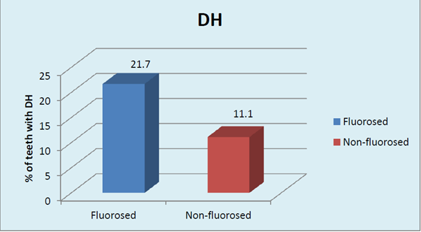 To the best of our knowledge, there are only two studies in literature related to DH in dental fluorosed subjects. Both the studies did not correlate the severity of DH with the severity of FL. Zero PI score was least (31.5%) in FL teeth than NFL (68.5%) teeth. The Plaque scores according to Turesky-Gilmore-Glickman modification of Quigley-Hein plaque index were found to be significantly higher in FL teeth. (p <0.001, HS)