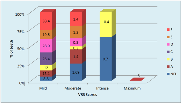 The gender based distribution of sample was not significant between FL and NFL groups. Sex matching was observed. No significant correlation was found between gender and prevalence of fluorosis. (Graph 2A). DH was significantly higher in both males and females in FL group compared to NFL group (p <0.001, HS). (Graph 2B). Mild to moderate pain due to DH was observed in both F & NFL teeth which were significantly higher in FL teeth using both AS & TS methods. Intense pain was found in one NFL tooth using TS method and 18.7% & 81.3% in FL & NFL teeth using AS method. (Graph 3A) Irrespective of the method used, 21.7% teeth had DH in the FL group compared to 11.1% in the NFL group. (Graph 3B). The order of number of teeth with different grades of Jackson’s fluorosis index was B>F>C >A >D>E. (Table 3) Chi-square analysis (x2 =2.87; p <0.001, HS) showed a highly significant correlation between severity of fluorosis and severity of dentinal hypersensitivity in terms of VRS scores. (Graph 4)