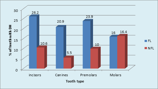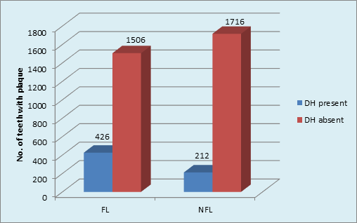 Intergroup comparison showed that a higher percentage (22%) of DH was found in FL than in NFL teeth (11%) [p <0.001, HS]. The role of plaque in inducing DH was obvious in FL teeth. (Graph 5) The type of NFL teeth affected maximum with DH was Molars (16.4%) followed by minimum in Canines 5.5%. The order of tooth type affected with DH in NFL group was: Molars>incisors>premolars>canine. Chi-square analysis (x2 = 22.7, p <0.001, HS) showed significant results. (Graph 6).