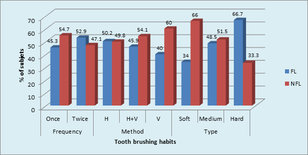 Graph 7 Prevalence of Tooth brushing habits in sample population: Medium toothbrush in FL and NFL (p = 0.02,Significant) .