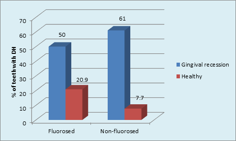 Irrespective of the method used, the prevalence of DH in FL group was 21.7% which was significantly higher than 11.1% prevalence in the NFL group. A highly significant correlation was found between severity of fluorosis and severity of dentinal hypersensitivity in terms of VRS scores. The Plaque scores were found to be significantly higher in FL teeth compared to NFL teeth which could be due to surface roughness of fluorotic teeth which occur as a result of fluoride induced structural changes. The plaque levels in teeth with DH in FL and NFL groups were highly significant within both the groups indicating a confounding role of plaque in the etiology of DH especially in fluorosed teeth.