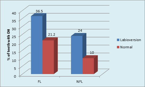 The role of labioversion in DH causation is presented here. The presence of teeth with labioversion in FL (45.4%) and NFL (54.5%) was not significant. (p = 0.18, NS) Tooth malpositioning e.g. Crowding, orthodontic tooth movement inadvertently repositioning teeth outside the buccal plate, increases the risk of gingival recessions which in turn can lead to DH.37 These teeth are difficult to clean by the patient, increasing plaque accumulation further leading to attachment loss and recession. However, there are no reports in literature reporting frequency of DH in such teeth. In the current study, first attempt has been made to record Labioversion of teeth and occurrence of DH. A tooth with labioversion is prone for GR which in turn may lead to DH. Significantly higher percentage (36.5%) of teeth in labioversion with DH in NFL group compared to FL group.