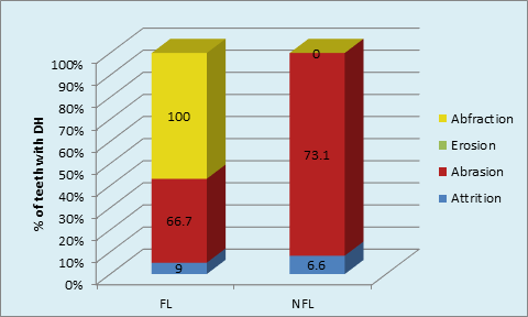 The presence of DH in teeth with attrition (9.0% & 6.6%); abrasion (66.7% & 73.1%) were found respectively in FL and NFL teeth. The distribution of DH in FL and NFL teeth was not significant. (p >0.05, NS) Abrasion as a cause of DH was significantly higher than others (attrition, erosion, abfraction) Intergroup comparison using z test for proportions showed significantly higher 394 (22.7%) teeth without wasting diseases having DH in FL group compared to NFL group 119 (7.6%). (p = 0.04) Inetrgroup comparison for attrition, abrasion, erosion, abfration was not significant between FL & NFL teeth. (p> 0.05). Peripheral dentin is covered by cementum on root surfaces, and enamel on coronal surfaces. Thus, loss of enamel can expose dentin, placing it at risk of developing dentin hypersensitivity. The loss of enamel is usually a result of the combined actions of attrition, abrasion, and erosion. Two processes need to occur for dentine hypersensitivity to arise: dentine has to become exposed (lesion localisation), and the dentine tubule system has to be opened and be patent to the pulp (lesion initiation). Exposure of dentine may occur by loss of either enamel or periodontal tissues. The present available evidence suggests that lesion initiation in dentine hypersensitivity can be induced by abrasive and erosive agents, and mostly erosion alone is probably the more dominant factor, in synergy with abrasion, to bring about dentine wear and tubule opening.