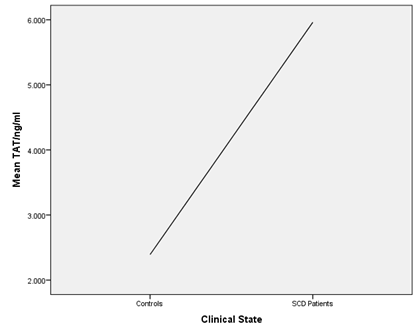 Thrombotic phenomena have important roles in the vasocclusive manifestations in sickle cell disease (SCD), this study was conducted to identify the possible inherited risk factors which can associated with sickle cell gene and the possible association with activation of coagulation process. Prolong PT, PTT and TT and high INR were observed in study subjects comparing with control subjects (Figure 1) but with significant difference (Value .000, .000, .004 respectively which reflect activation of coagulation process occurs in SCA during steady state and exhibit high levels of thrombin generation markers and fibrinolytic system (TAT=5.96 ng/ml versus 2.39 ng/ml in controls with significant P.value.003,D-dimer level in SCD patients reach 2366 ng/ml versus 884ng/ml in controls with significant value 001 . This may be attributed to increase tissue factor expression even in non-crisis.15 It is suggested that free haemoglobin released upon haemolysis induce tissue factor expression of the blood vessels, and platelets activation.8 Other factors attributed to the activation of coagulation process, are exposure of erythrocyte phosphatidyl serin and erythrocyte ethanolamine which occurs due to elevation intracellular calcium (Ca2+) upon deoxygenation.8,16 As well as,enhanced circulating microparticles which originated from erythrocytes, white cells, platelets and endothelial cells as Monocyte Microparticles (MMP)which is considered as dominant source of Microparticles (MP)-borne TF and has been reported in sickle cell disease in many studies.17 Generally, vasocculssion events related to activation of coagulation pathway and impairment of the vessels.18