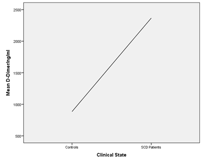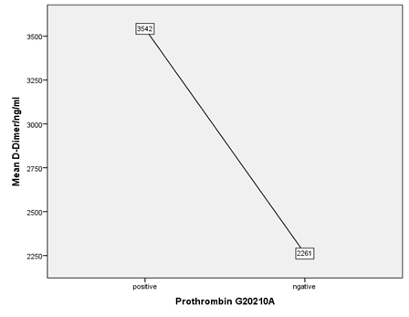 Figure 5 Means of D-dimer/ng/ml in Positive and negative prothrombin mutation in SCA patients (Higher mean level in positive patients).