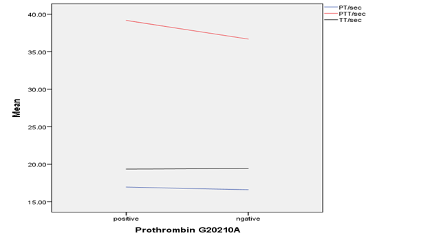 Figure 4 Means of coagulation tests in positive and negative prothrombin mutation in SCA (Higher level of PTT showed in positive patients).