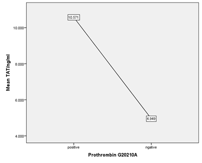 Figure 6 Means of TAT/ng/ml in Positive and negative prothrombin mutation in SCA patients (Higher mean level in positive patients).