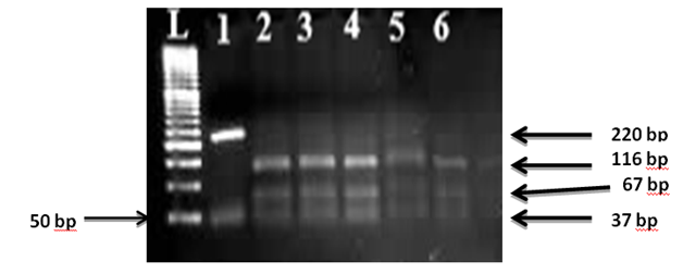 Figure 7 Wild type Fv (RFLP) L: 50 bp ladder, lane 1 Undigested 220 bp, lane 2-6 represents wild type fragments of 116,67 and 37 bp.