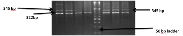PCR was performed and the test was carried out in a total volume of 20µl, PCR reaction containing 5 μl of the extracted DNA, 2 μl from the primers Factor V Leiden forward (5'CTTGAAGGAAATGCCCCATTA–'3) and reverse (5’TGCCCAGTGCTTAACAAGACCA-3’), Prothrombin Mutation 202021 Forward(5'-TCTAGAAACAGTTGCCTGGC-'3) Reverse (5-ATAGCACTGGGAGCATTGAAGC-3) and8μl of distilled water was added to the Dream Taq Green PCR Master Mix DNA marker “Gene Ruler” were provided by Thermo Scientific (Lithuania). The amplification for FV Leidnwas done by 35 cycles of PCR reaction (initial denaturation at 94oC for 5 minutes,denaturation at 94°C for 1 min, annealing at 56°C for 1min and extension at 72°C for 1 minute. A final extension was performed at 72°C for 5 minutes). Therestriction enzyme Mnl (5,000 units/ml) was used to digest a 267-bp amplified fragment, 10 μl of PCR product was digested with 5 unit of DNA restriction enzyme Mnl1 at 37oC for 30min and overnight, then product was separated on 4% agarose gel electrophoresis and the product was visualized by staining with 0.15% ethidium bromide using UV gel documentation system.The amplification for ProthrombinMutation202021was done by 40 cycles of PCR reaction (initial denaturation at 94oC for 5 minutes, denaturation at 94°C for 30 sec, annealing at 58°C for 30 sec and extension at 72°C for 30 sec. A final extension was performed at 72°C for 5 minutes).product shows a segment of 345 bp.Therestriction enzyme Hind111(20,000 units/ml)was used to digest a 345-bp amplified fragment of patient, 10 µl of PCR product was digested with 10 unit of DNA restriction enzyme at 37oC Hind111 for 60min and overnight, theproduct was separated on 2% agarose gel electrophoresis and the product was visualized by staining with 0.15% ethidium bromide using UV gel documentation system.14